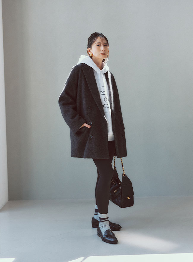 - ジップやフードなどのカジュアルトップスをレイヤードしたスタイルもおすすめです。