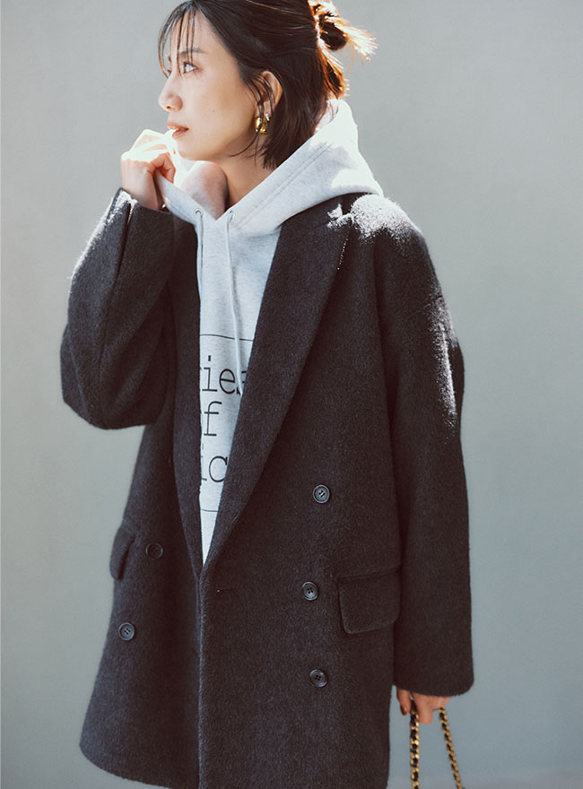 - ドロップショルダーのゆったりとした着心地で、中に厚手のニットも着用できます。