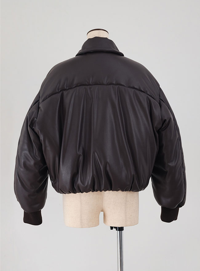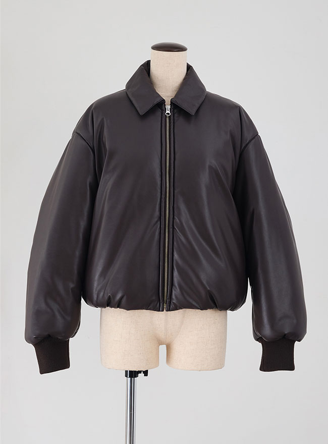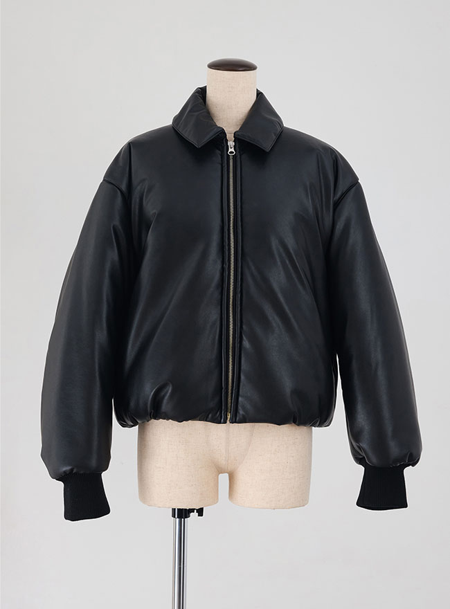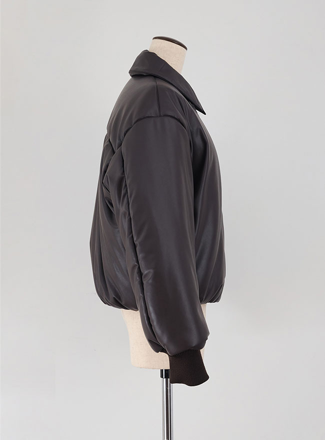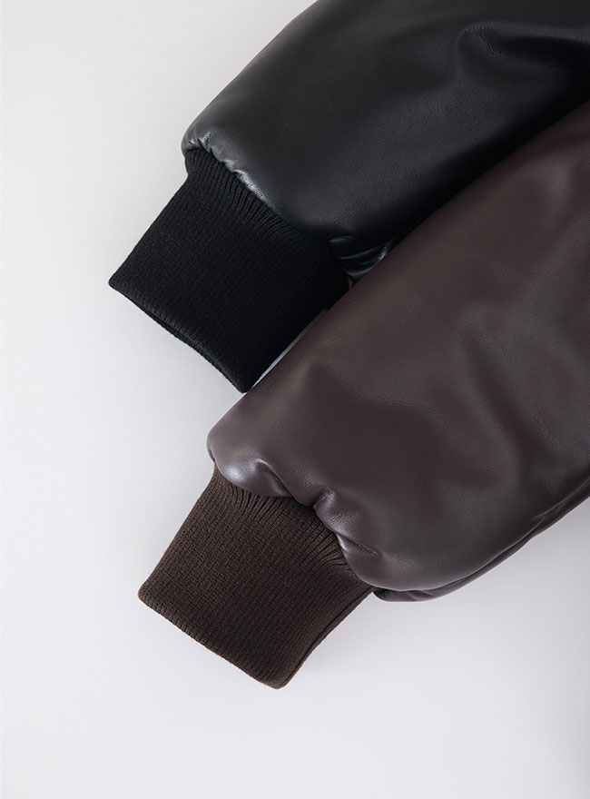 ゆったりしたシルエットが魅力のフェイクレザーボンバージャケット - 程良く丸みを帯びたフォルムが柔らかい雰囲気を与えます。
