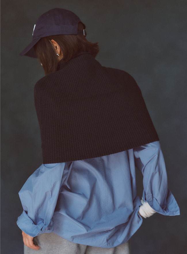 - ローゲージの畦編みで伸縮性があり、軽い羽織りの上に重ねたり、室内で肌寒い時にストール代わりにさっと被れるなど、幅広いシーンでの着用ができます。
