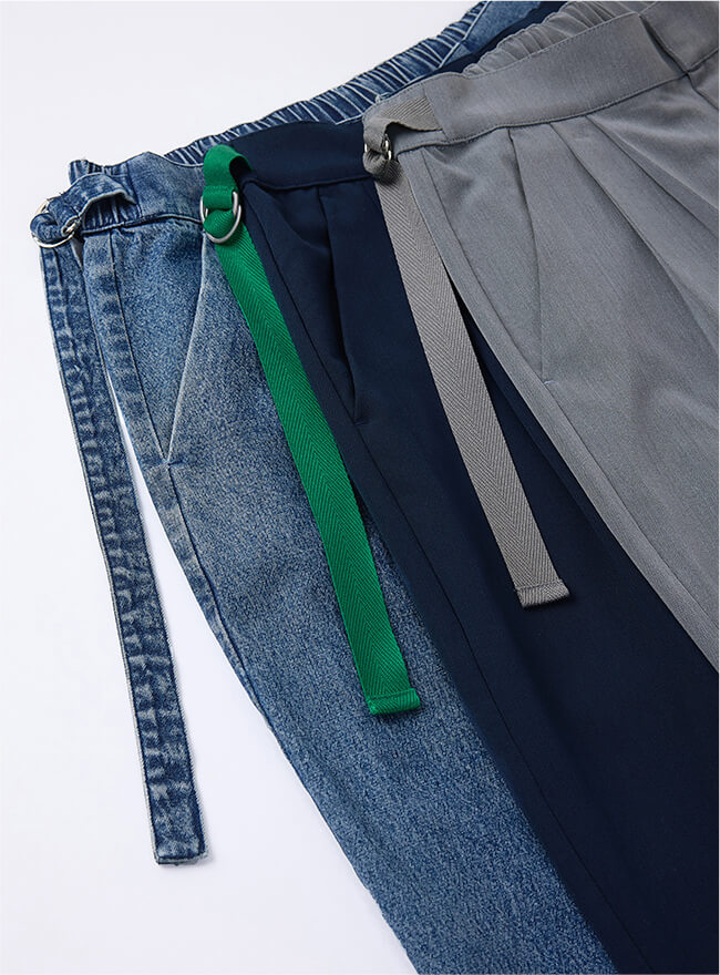 - アジャスターテープは、グレー地にはグレー、デニム地にはデニム。ネイビ―地にはグリーンでアクセントを付けました。