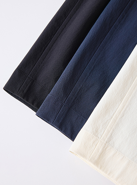 撥水、接触冷感機能を施し、大人カジュアルが叶うカーブパンツをお作りしました。
