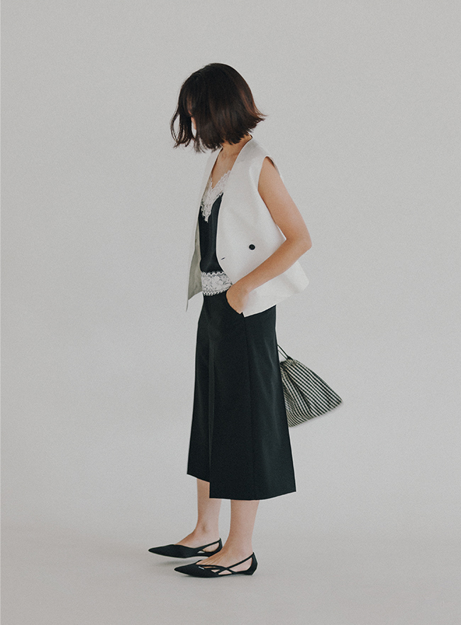 - ブラックとホワイトのバイカラーが甘くなり過ぎず、モードな印象に。