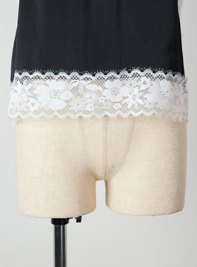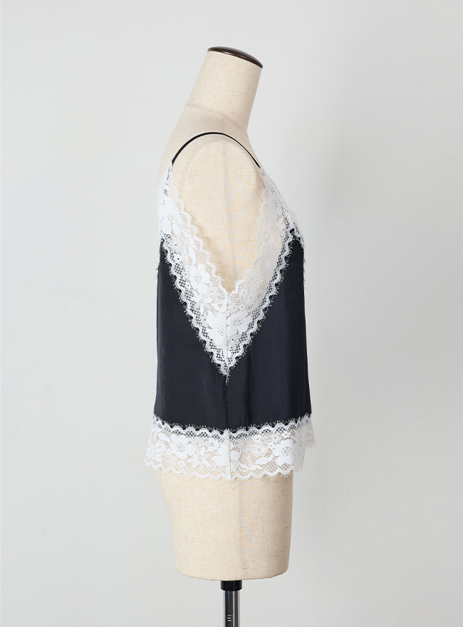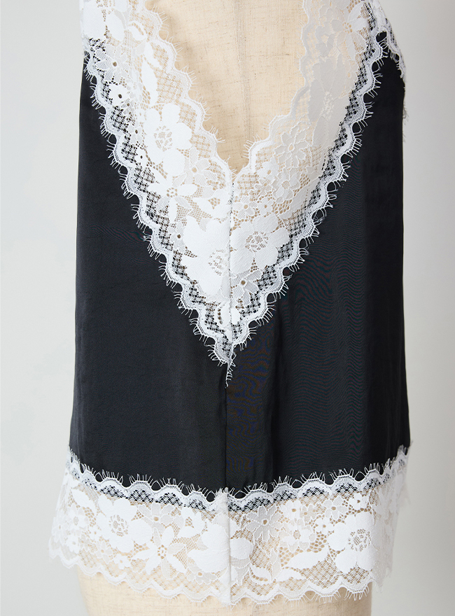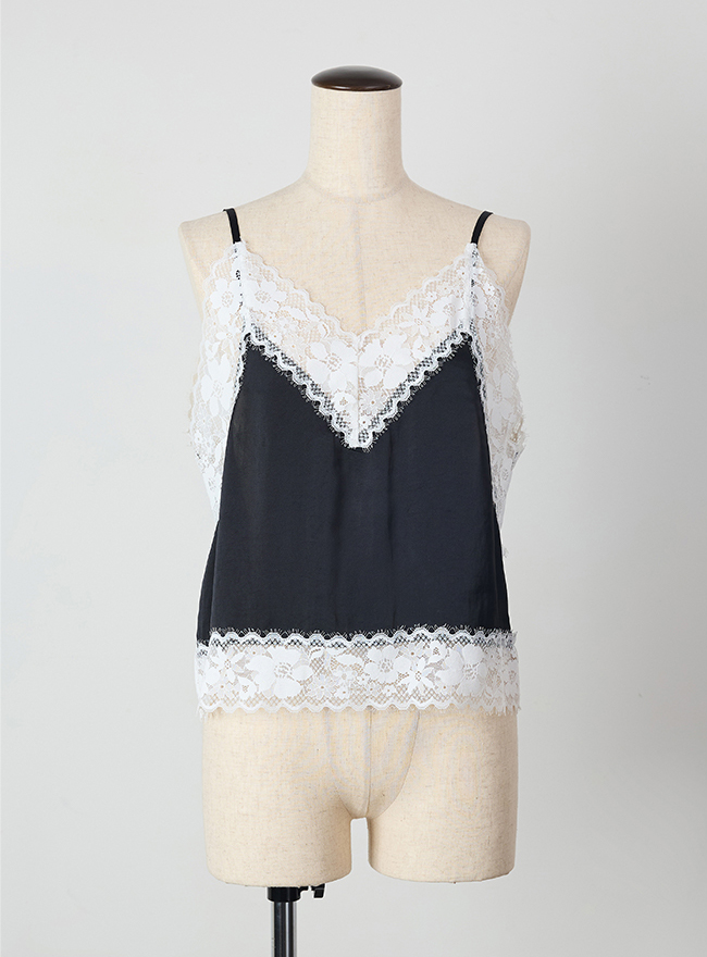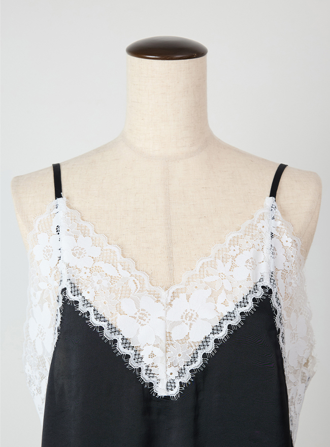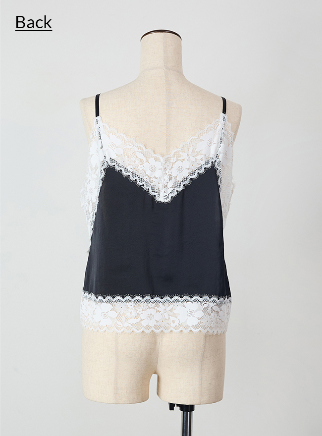 - 繊細かつ上品なレースを上下に大胆に使用した大人な雰囲気のサテンレースキャミソールです。