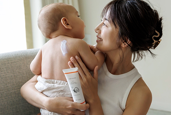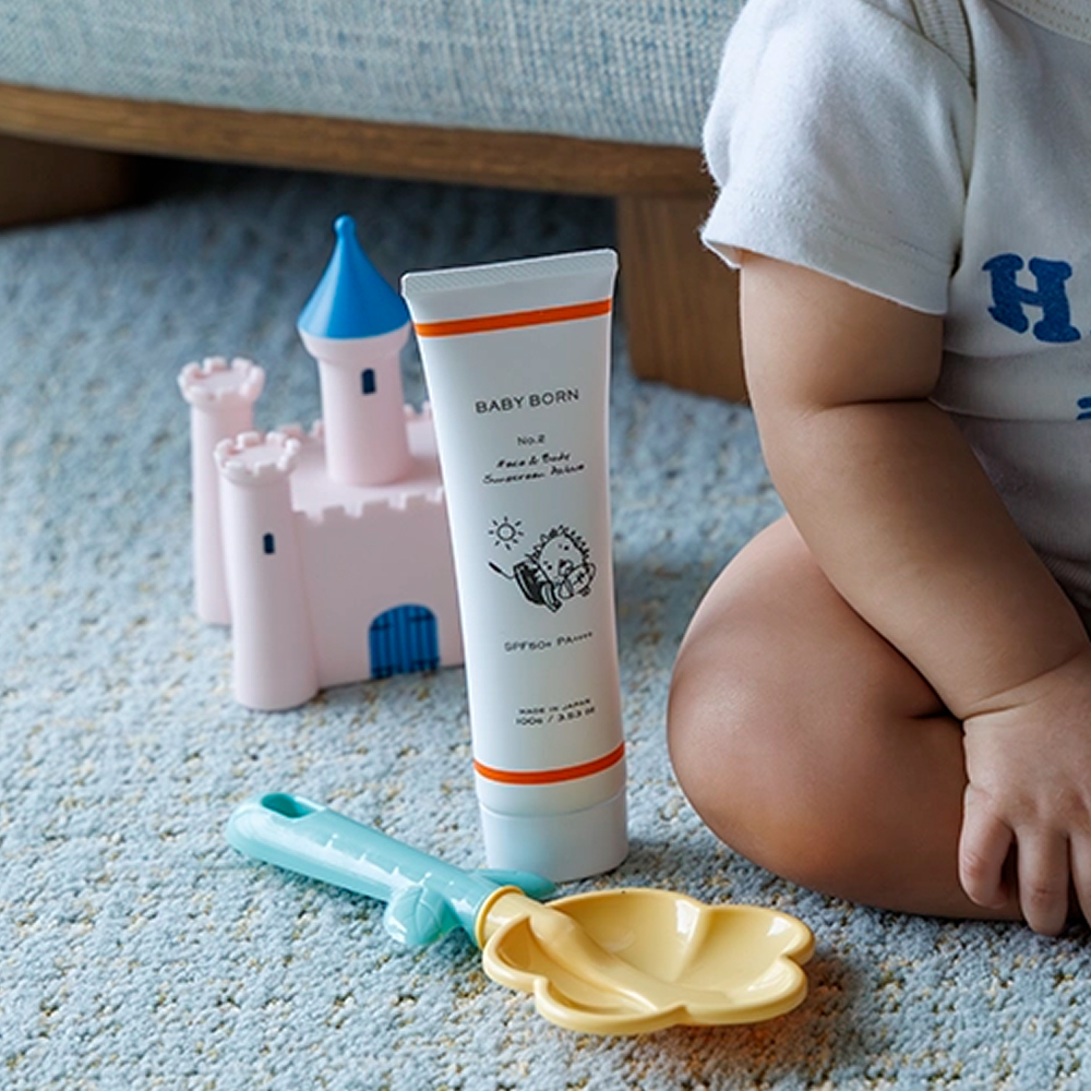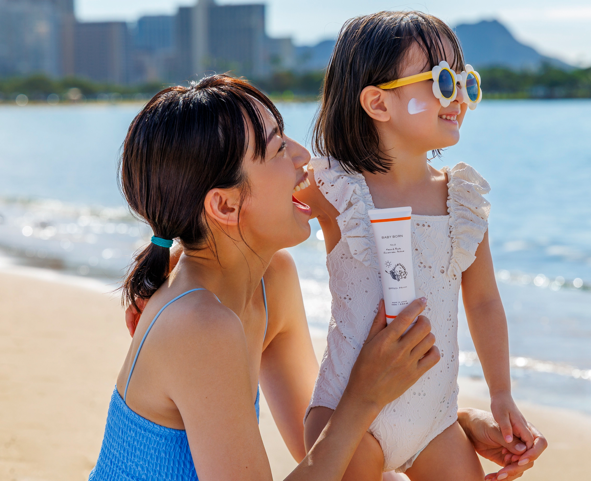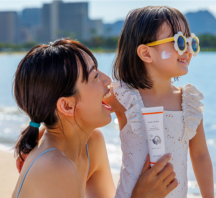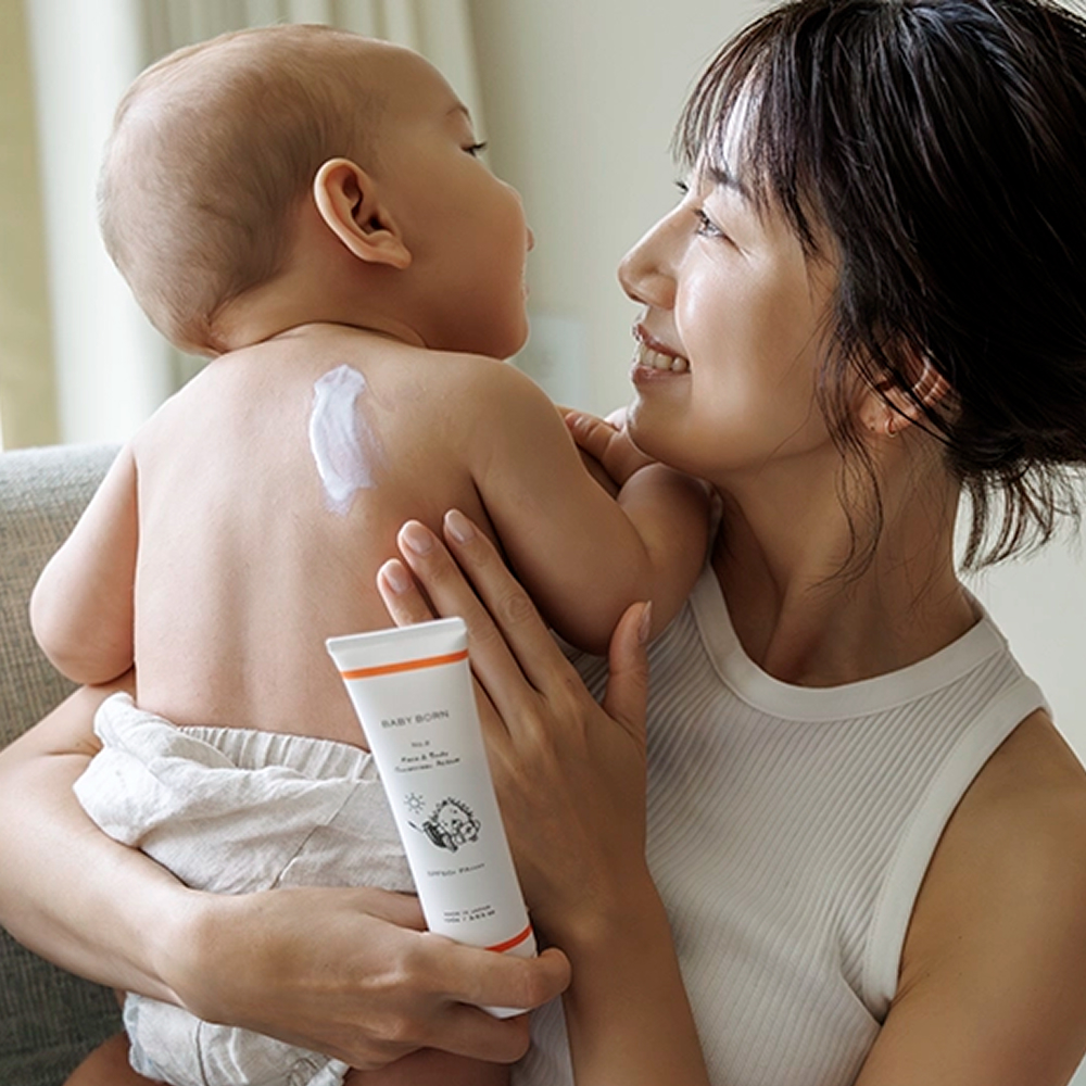 デリケートな肌を守るため、開発段階から徹底して「やさしい配合」にこだわりました。赤ちゃんを対象とした使用試験*1をはじめ、アレルギーテスト、パッチテストをクリア*2。肌のことを考えた紫外線吸収剤フリーで、赤ちゃんから大人まで、家族みんなでお使いいただけます。
