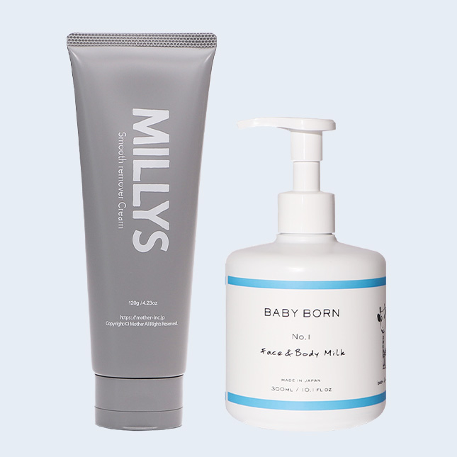 SET DETAILS MILLYS Smooth remover Cream 家族みんなでできる 除毛ケアを お子さまの成長につれて、悩みの種も変化し、「ムダ毛」もその一つ。年頃の娘さんがサロンに通うにはまだ早く、カミソリを使うのも心配だという親の悩みに応え、家族みんなで使える除毛クリームを作りました。無添加の植物エキス配合で、肌を保護しながらムダ毛ケアができます。 詳しくはこちら